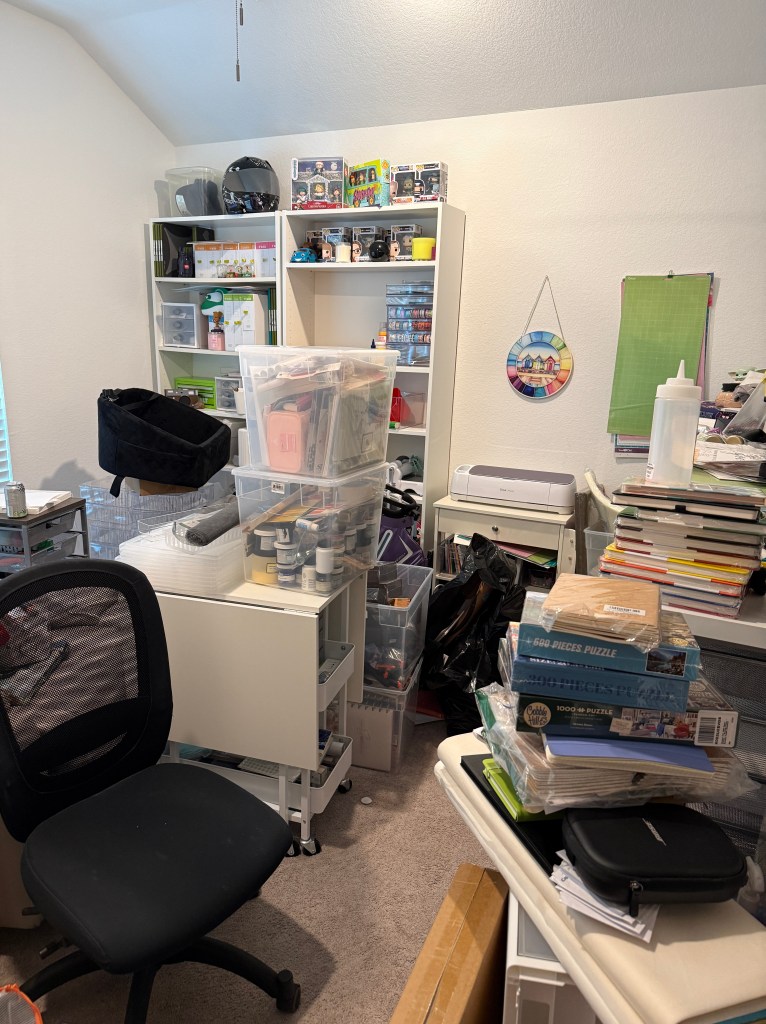 I have a bedroom that is designated to be my office, though I haven’t used as an office since we moved in. It has been mostly used as a junk/storage room, and I want to reclaim it. I’m getting started with genealogy again, and I’d really like to be able to spread out when I’m working on things, so I want to transform it from a junk room to a nice office where I can hang out during the day when I’m not busy with something else. I already have a recliner and a TV in there. Now I need to clean it up and reconfigure everything. My work is definitely cut out for me!