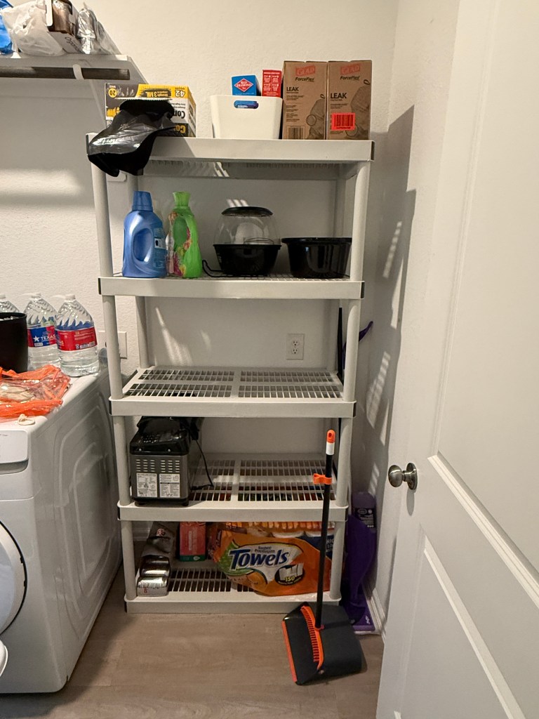 Our kitchen cabinets have one small half shelf in them, which is both infuriating and useless. While all of these shelves are the same size throughout the cabinets, they are either not big enough to be useful, or they are so big it gets in the way of storing larger items like bread makers and Instant Pots. So I’m creating a new storage space for the appliances in the laundry room.